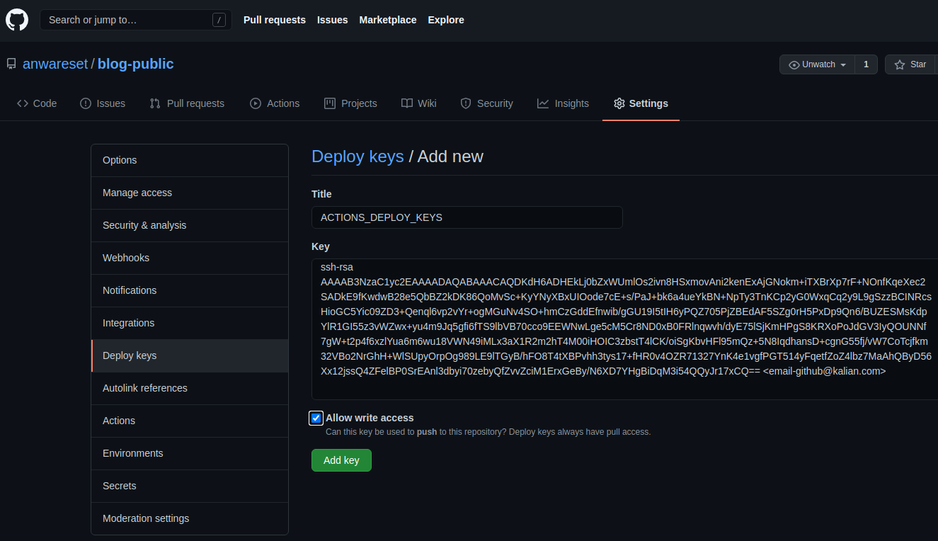 Silahkan buka halaman Settings pada repository blog-public, lalu pilih Deploy keys. Tambahkan public keys dengan nama ACTIONS_DEPLOY_KEYS.