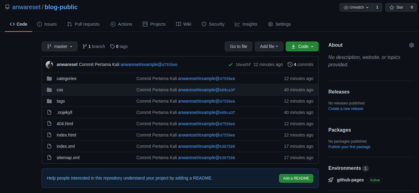 Semua perubahan telah dilakukan pada direktori project Hugo example, sekarang kita akan melakukan pengujian apakah dengan melakukan push ke remote repository akan memberikan efek ke repository blog-public.