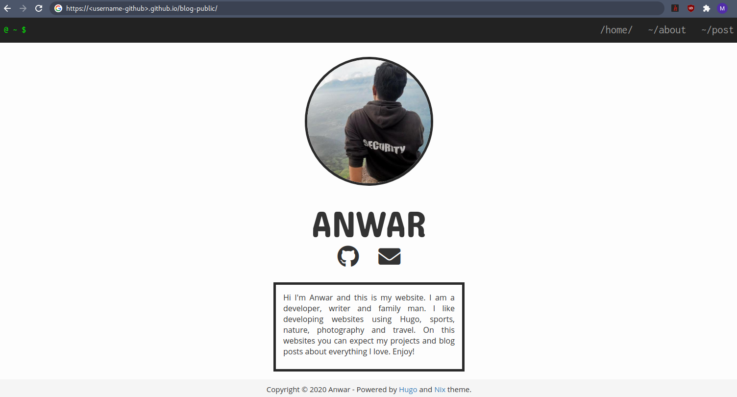 Terlihat bahwa Github Actions berhasil menjalankan push secara otomatis ke repository eksternal blog-public. Dan hasil build Hugo dapat kita buka pada Github Pages dengan URL berikut.