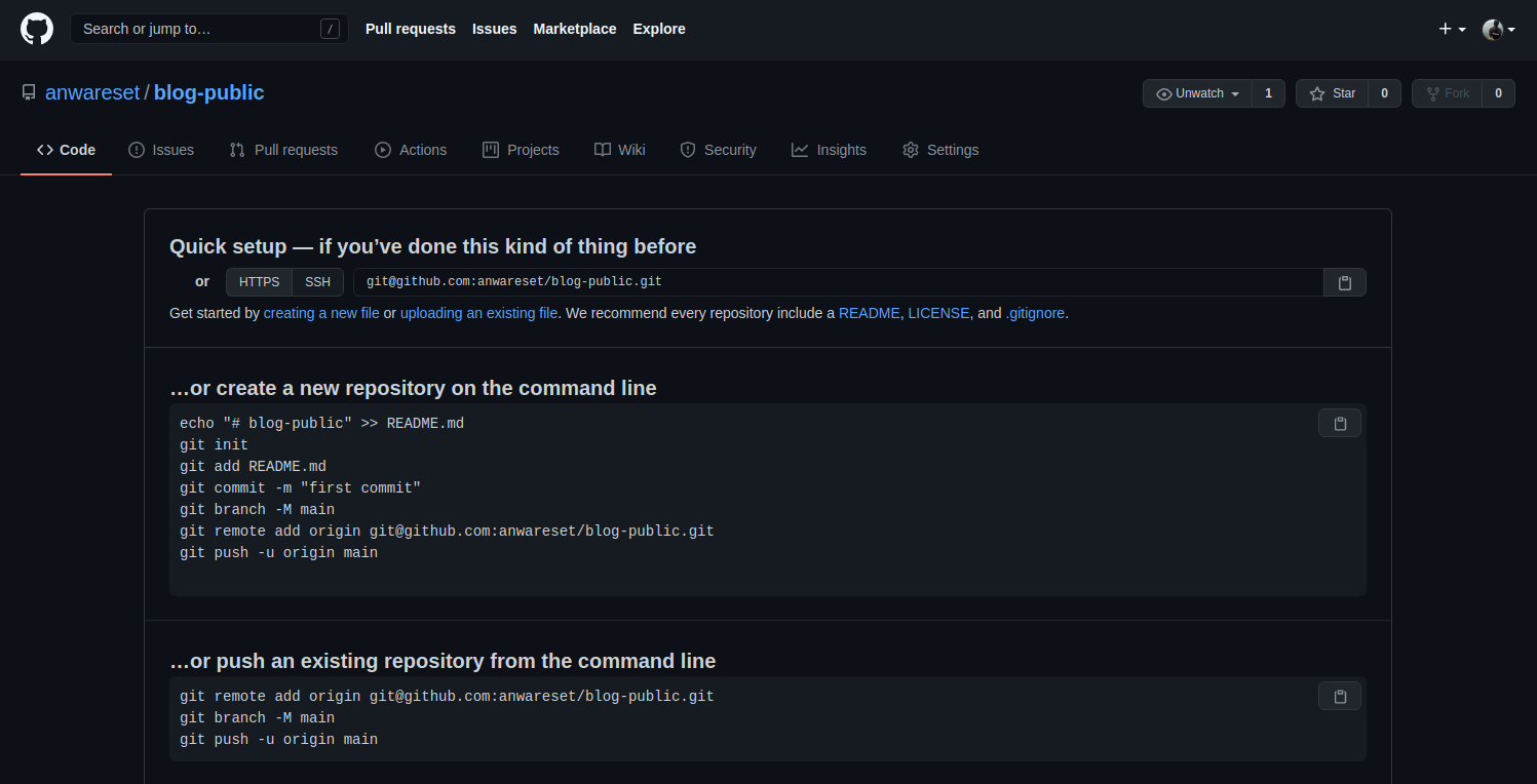 Kita perlu membuat remote repository lain di Github, misalnya dengan nama blog-public. Nantinya repository baru tersebut akan menampung file-file hasil generate Hugo secara otomatis dari repository example.