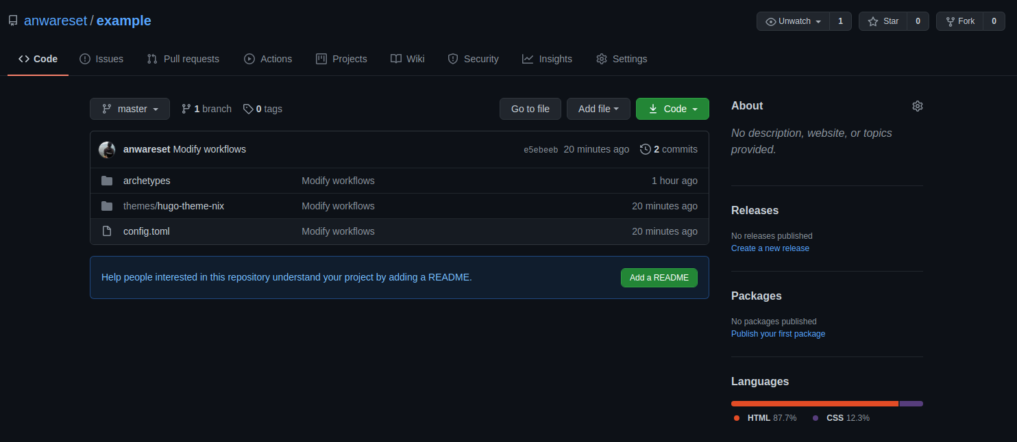 Anggap kita sudah memiliki sebuah project situs website Hugo bernama example dengan struktur direktori seperti di bawah. Lalu kita anggap bahwa project kita telah terintegrasi dengan remote repository di Github.