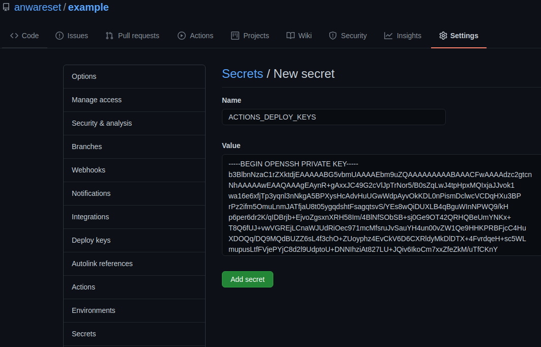 Buka halaman Settings pada repository example, lalu pilih Secrets. Tambahkan secret baru dengan nama ACTIONS_DEPLOY_KEYS, berisi private key yang baru saja kita salin.