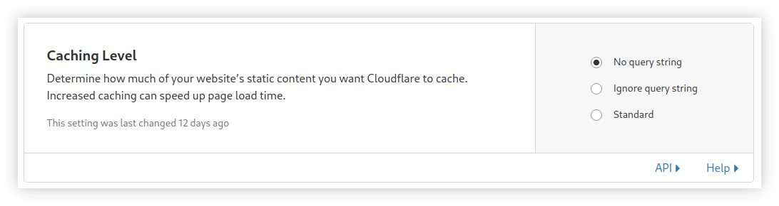 Ini adalah salah satu fitur yang paling dicari di Cloudflare, kita dapat menemukannya pada menu Caching. Di sini saya hanya mengaktifkan Caching Level seperti berikut.
