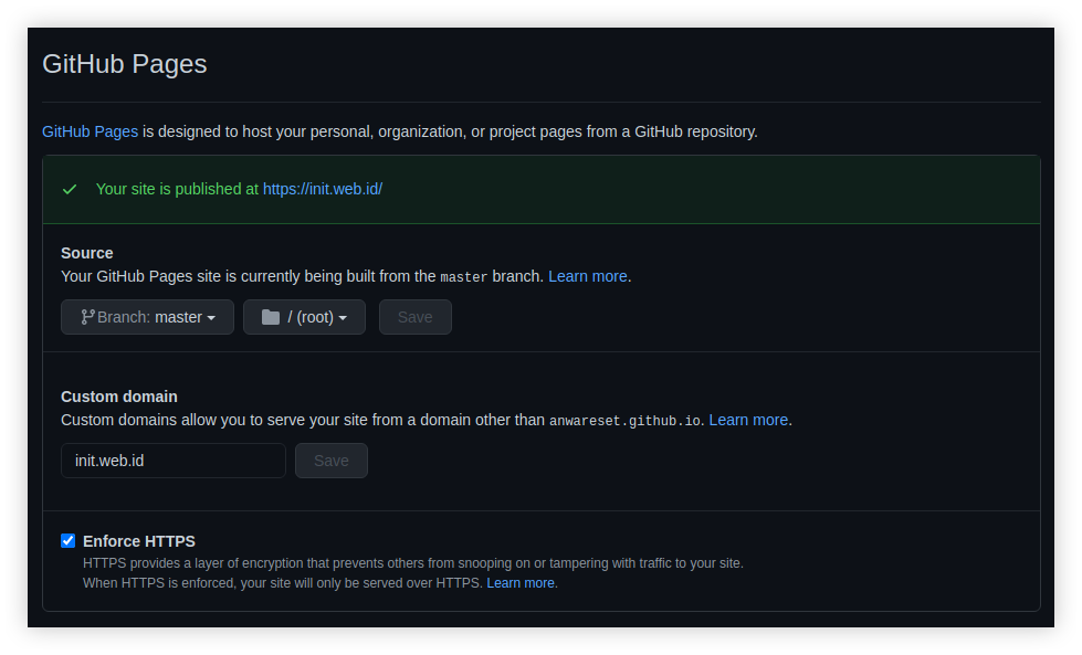 - Sebuah situs web yang menggunakan Github Pages sebagai hosting. Contohnya seperti yang telah saya tulis pada artikel Custom APEX Domain untuk Github Pages.
