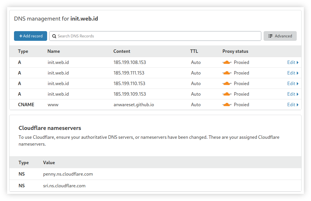 A records merupakan IP miliki Github yang saya dapatkan dari docs.github.com.