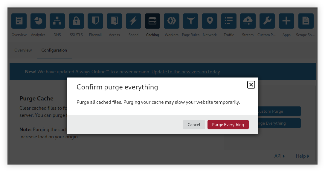 Untuk menerapkan semua konfigurasi yang telah dibuat, saya menghapus semua cache yang telah tersimpan di Cloudflare dengan menggunakan Purge Everything pada menu Caching di dashboard Cloudflare.