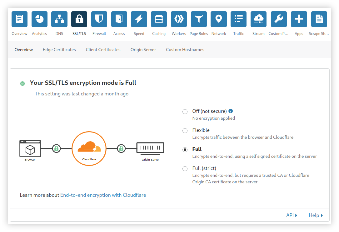 Kita perlu mengaktifkannya terlebih dahulu pada menu SSL/TLS di dashboard Cloudflare.