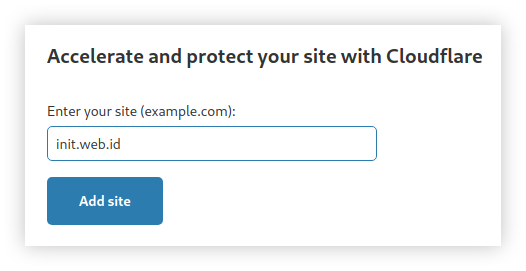 Login ke dalam halaman dashboard Cloudflare menggunakan akun yang sebelumnya telah dibuat. Kemudian tambahkan situs web dengan memasukkan alamat domainnya.