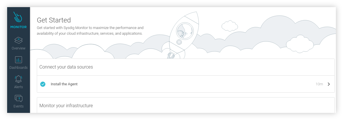 Buka kembali dashboard front-end Sysdig, apabila Sysdig Agent berhasil terpasang maka seharusnya pada halaman Get Started akan muncul tampilan seperti berikut.