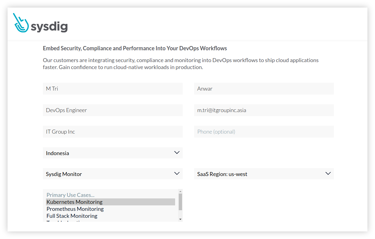 Isi beberapa data yang dibutuhkan seperti nama, jabatan pekerjaan, alamat email, nama perusahaan, dan negara. Kemudian pilih Trial Offer yang dibutuhkan, misalnya Sysdig Monitor. Untuk SaaS Region dapat dipilih berdasarkan di mana letak infrastruktur kita berada. Karena saya menggunakan layanan AWS di Amerika Serikat untuk menjalankan klaster OpenShift, maka saya memilih Region us-west. Kemudian untuk Primay Use Cases dapat di pilih apapun, misalnya Kubernetes Monitoring.
