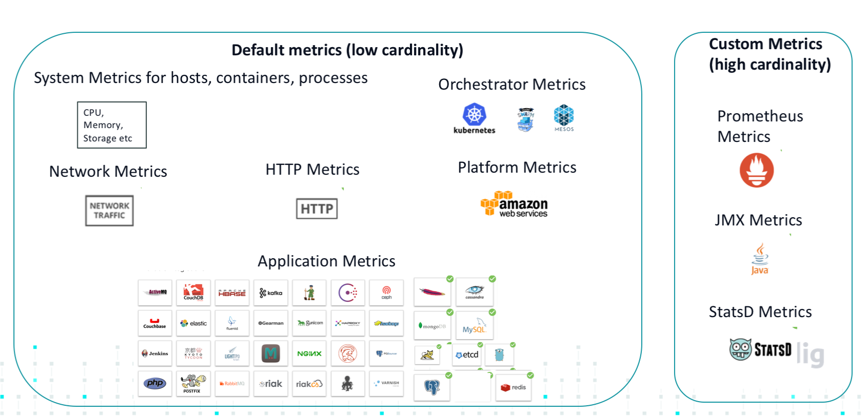 - Custom metrics, berhubungan dengan metric yang didapat dari aplikasi pihak ketiga seperti JMX, StatsD, Prometheus dan beberapa metric dari aplikasi lain yang terintegrasi.