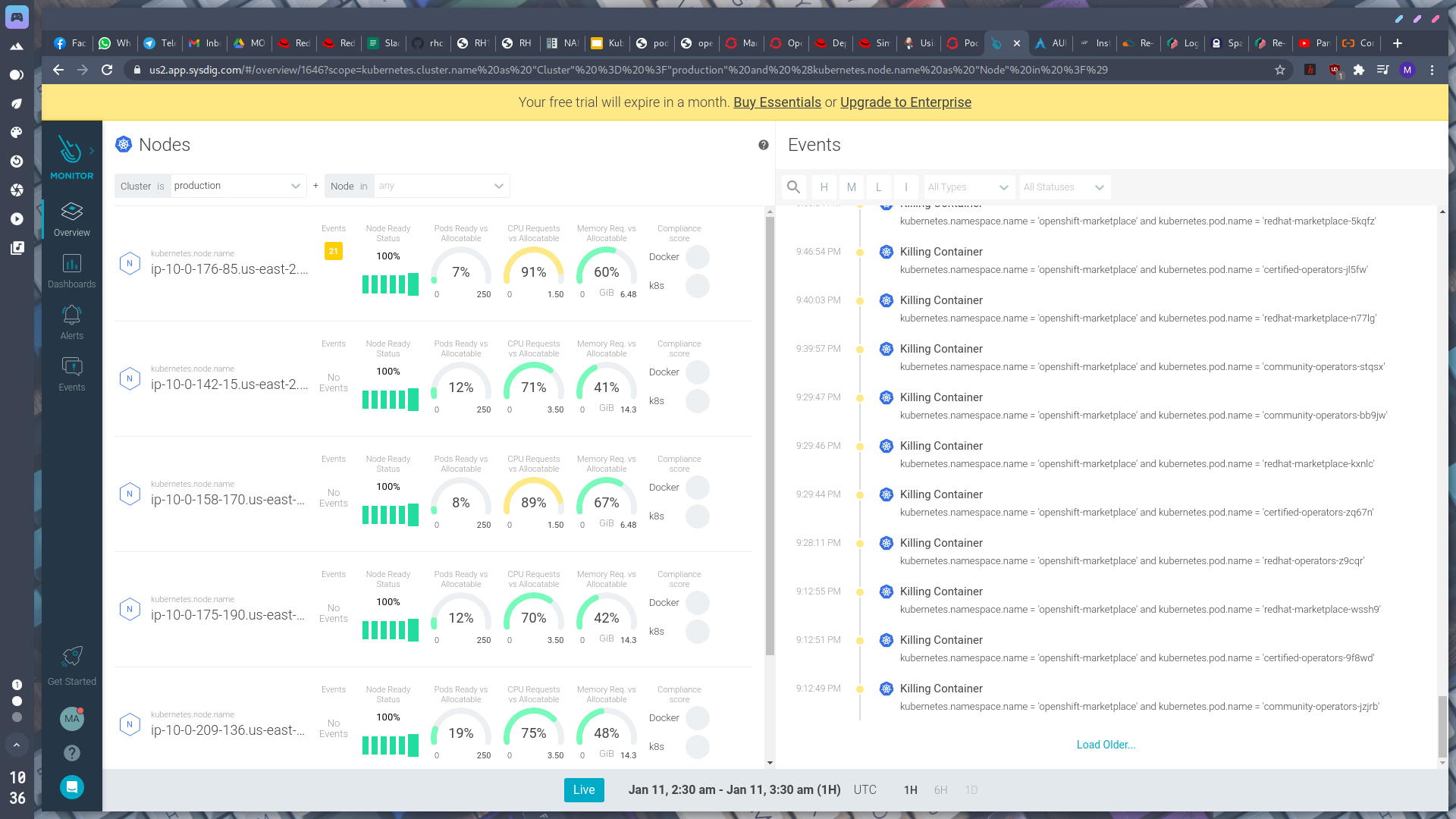 Jika kita ingin melakukan inspeksi lebih lanjut terhadap container yang ada pada klaster, sebenarnya kita dapat memilih menggunakan Sysdig Platform di mana kita juga akan mendapatkan Sysdig Secure untuk keperluan forensik atau kebutuhan lain terkait keamanan pada klaster. Pada bagian Settings di Sysdig Monitor kita akan mendapati beberapa fitur Notification Channels yang lumayan berguna. Fitur tersebut dapat kita kombinasikan dengan menu Alerts untuk mengirimkan pemberitahuan langsung melalui beberapa macam layanan seperti Email, Slack, hingga WebHook. Sebagai alternatif lain dari Sysdig kita dapat menggunakan tools seperti GAP Stack (Grafana, Alertmanager, Prometheus) atau DataDog. Sebelumnya saya mencoba untuk mengintegrasikan Sysdig pada OKD namun menemui issue pada pod Sysdig Agent, selanjutnya saya putuskan untuk mencobanya di klaster OpenShift dan Sysdig Monitor dapat berjalan tanpa kendala.