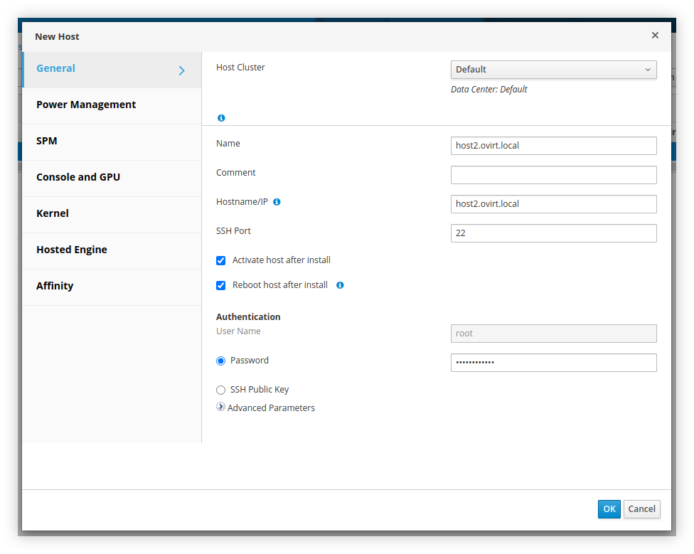 Tambahkan host2.ovirt.local ke datacenter oVirt yang berhasil kita deploy. Caranya adalah dengan masuk ke menu Hosts pada oVirt Webmanager Web Portal. Lalu pilih New dan masukkan hostname serta kata sandi dari user root. Tunggu beberapa saat, sampai host baru reboot dan berhasil join ke datacenter oVirt.