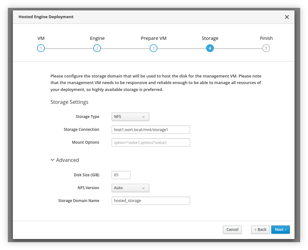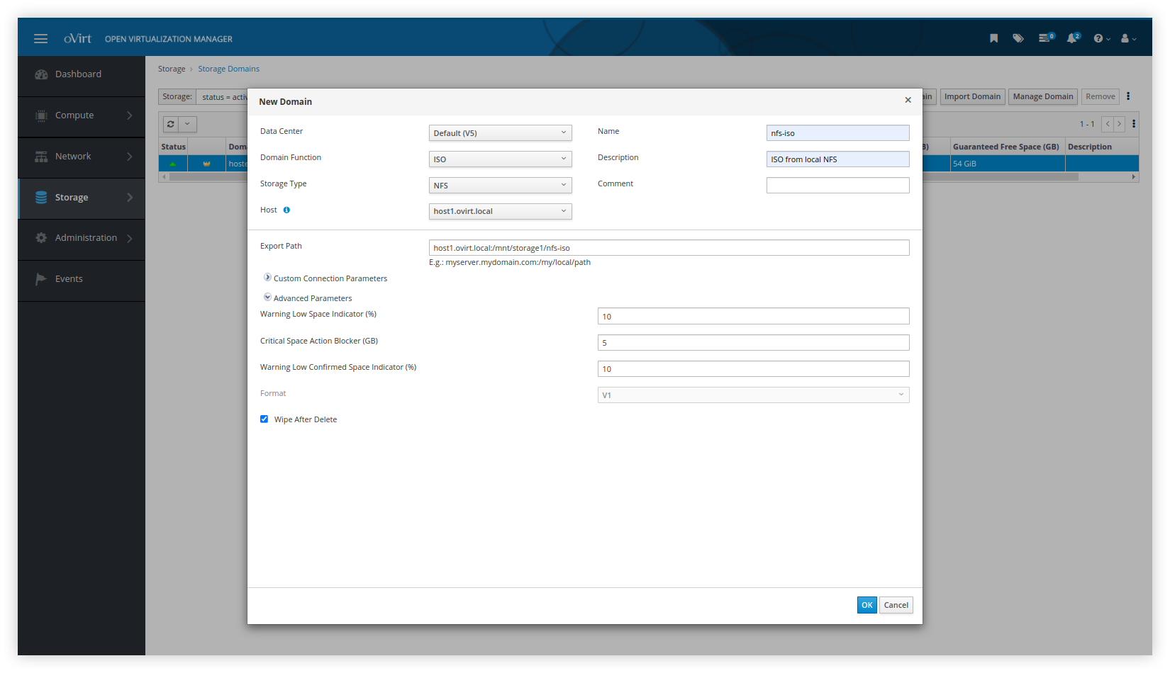 Seusai VM Self-hosted Engine sudah berhasil dinyalakan, kita lanjutkan dengan membuat Storage Domain. Fungsinya nanti adalah untuk menampung berbagai images baik file ISO Installer maupun virtual disk bagi VM yang akan dibuat. Karena sebelumnya kita sudah membuat NFS server, maka seharusnya sekarang tinggal kita hubungkan saja seperti berikut.