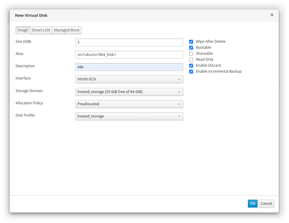 host1.ovirt.local diperlukan tambahan disk yang nantinya dijadikan sebagai NFS server. Setelah instalasi VM Self-hosted Engine selesai, memori pada host ini juga dapat kita resize sesuai kebutuhan, misalnya kita turunkan menjadi 5 GB. Jumlah memori awal sebesar 8 GB hanyalah untuk mencegah terjadinya kegagalan ketika proses deployment yang disebabkan oleh minimnya ketersediaan memori.NFS Server