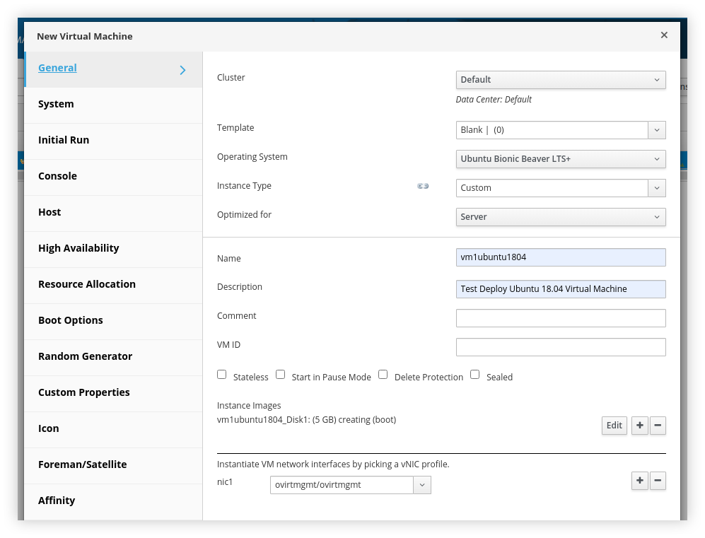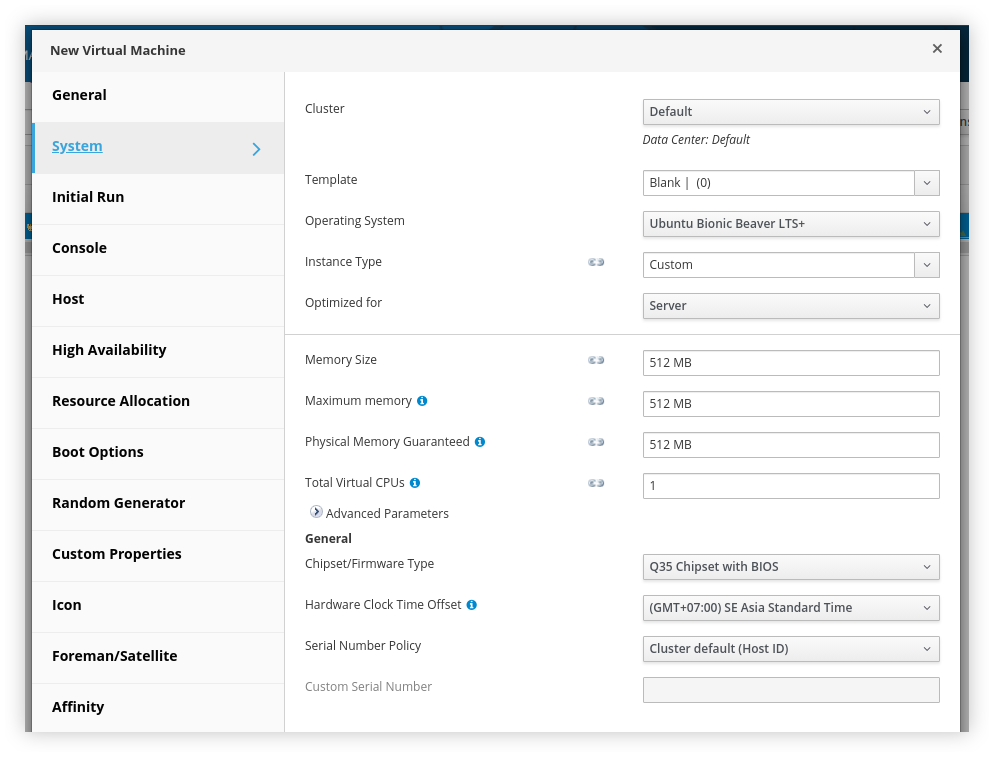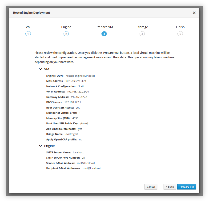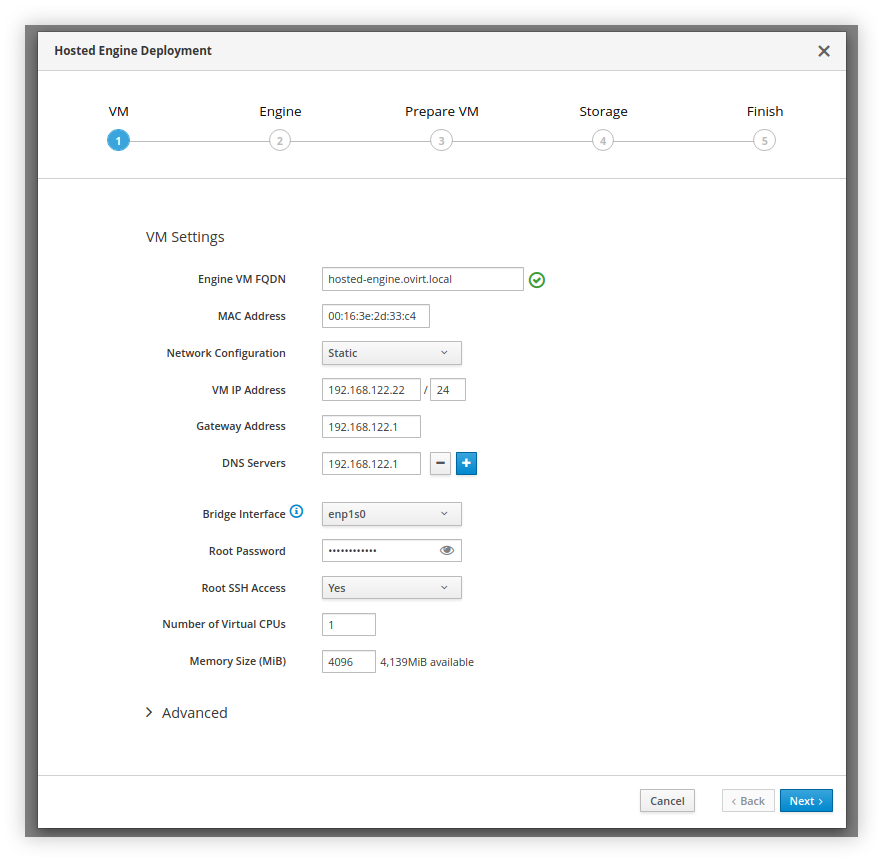 Sesuaikan Engine VM FQDN dan VM IP Address dengan konfigurasi yang sudah dibuat pada /etc/hosts. Resize Memory Size (MiB) ke batas terendah (4096) serta Number of Virtual CPUs menjadi 1 saja, namun hal ini dapat disesuaikan dengan spesifikasi host yang kita hendaki.