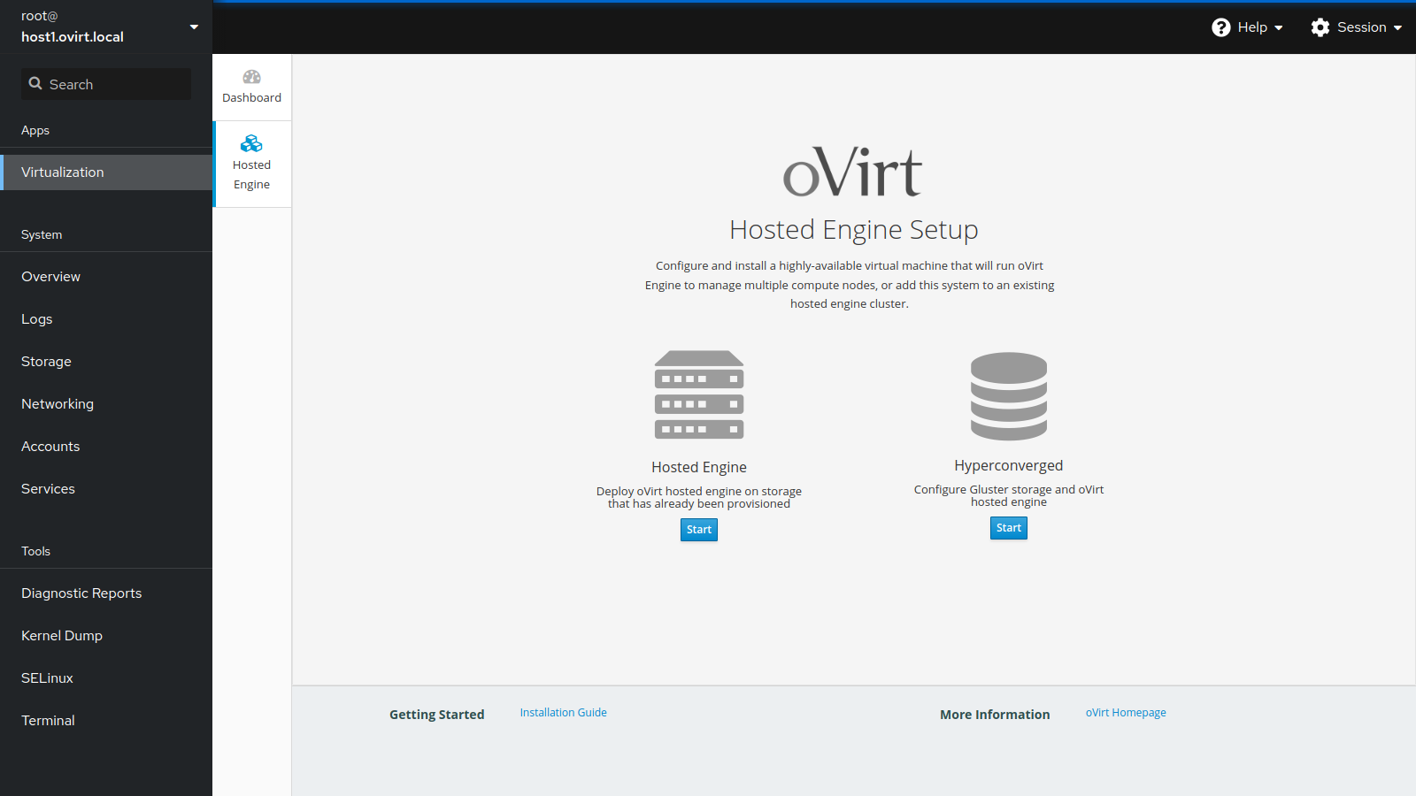 Buka cockpit lewat web browser dengan URL https://host1.ovirt.local:9090/ovirt-dashboard#/he untuk deploy VM Self-hosted Engine. Gunakan username root dan kata sandi yang telah dibuat ketika instalasi oVirt Node. Setelah berhasil login, klik Start pada Hosted Engine.