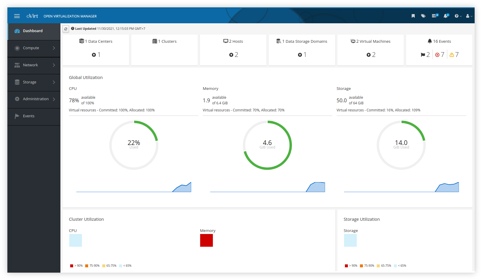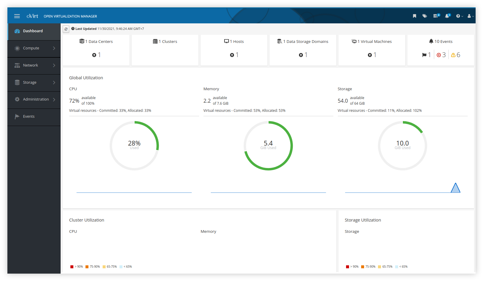 Sementara berikut ini adalah Overview dari oVirt Webmanager, terlihat bahwa dua VM sedang berjalan dan resource berkurang karena digunakan oleh VM baru.