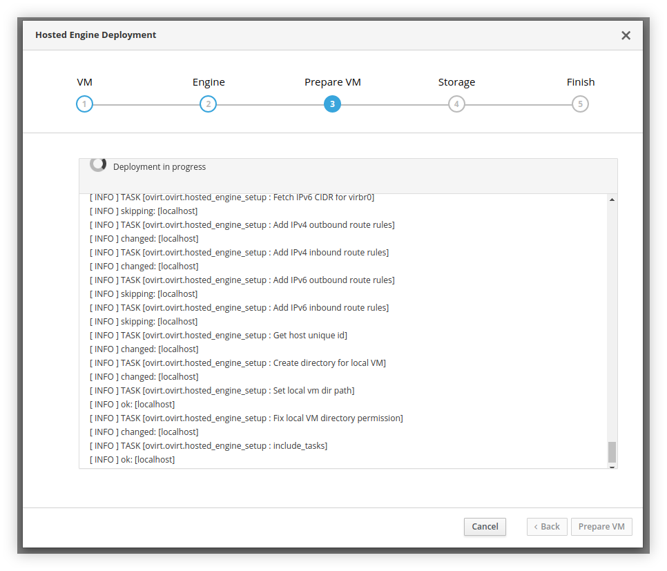 Jika kita lihat dari output log, deployment dijalankan oleh Ansible. Durasi yang diperlukan untuk deployment sangat bergantung pada kecepatan koneksi jaringan internet, spesifikasi VM host, serta hardware komputer yang kita miliki. Dalam kasus saya, internet berkecepatan sekitar 5MB/s dengan spesifikasi host pada artikel ini, memakan waktu hingga sekitar 1 jam.