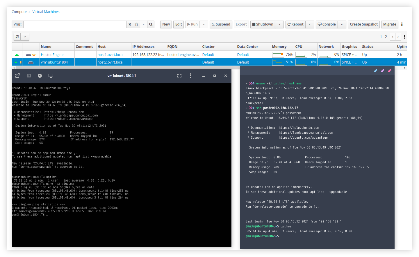 Instalasi OS telah berhasil dilakukan pada VM di atas, jika dilihat pada sisi oVirt Webmanager akan terlihat statusnya Up yang menandakan VM telah berjalan. VM juga sudah dapat mengakses internet